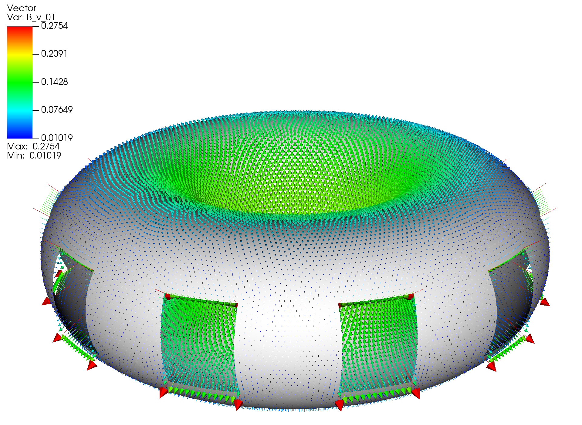 Next use VisIt to open the surf_static.xmf file, which will contain a series of vector fields named as J_XX and B_v_XX that correspond to the current distributions and magnetic field of the various eigenstates respectively. If you are running this example remotely and using VisIt locally you will need to copy the mesh.*.h5, scalar_dump.*.h5, vector_dump.*.h5, and *.xmf files to your local computer for visualization. The first eigenmode J_01 should look like the figure below.