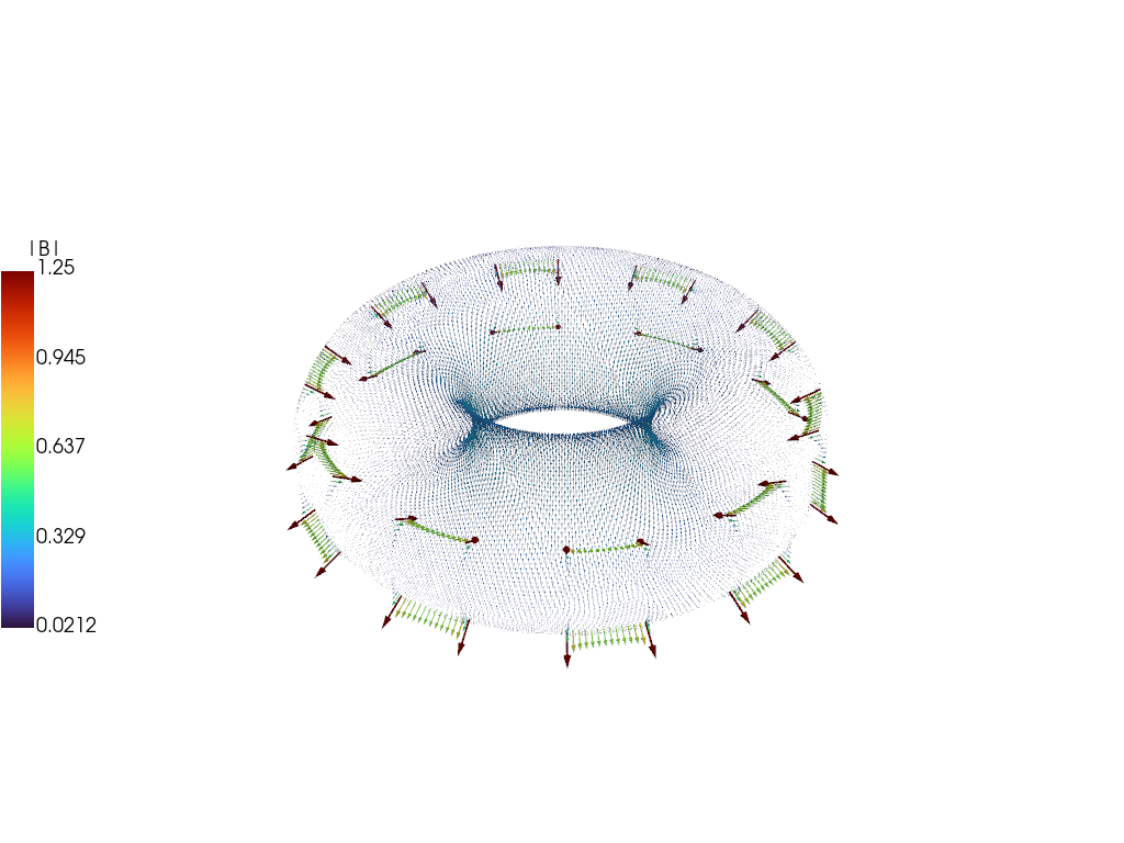 To visualize the results we define three Mirnov sensors spanning one port period, just outside the torus. While every sensor in ThinCurr is a flux loop, helper classes for defining specific types of common sensors (eg. circular loop or Mirnovs) are available in OpenFUSIONToolkit.ThinCurr.sensor, which also contains the save_sensors() function for saving this information to a ThinCurr-compatible file format.