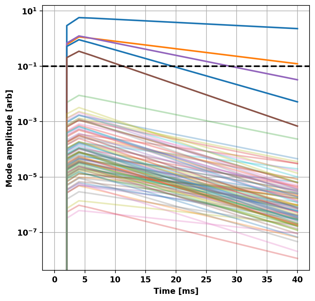This makes sense as all the sources driving our system are axisymmetric (single circular current filament) and as a result we expect all the eigenstructures with toroidal mode number greater than zero to have very little coupling to this structure (ideally zero). Additionally, as the L/R system results in orthogonal eigenvectors we don't expect any coupling between modes themselves. This can be seen as all modes decay exponentially (linear on semilog plot) after the driving voltage drops to zero.