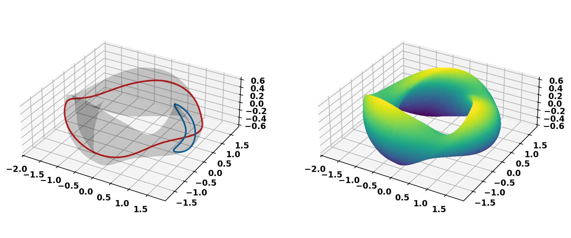 We can now create ThinCurr models for the winding and plasma surfaces using a REGCOIL definition of the NCSX stellarator using build_regcoil_grid() and ThinCurr_periodic_toroid, which provides functionality for working with toroidally periodic meshes. The result are ThinCurr_periodic_toroid objects for the plasma (plasma_grid) and winding surface (coil_grid).
