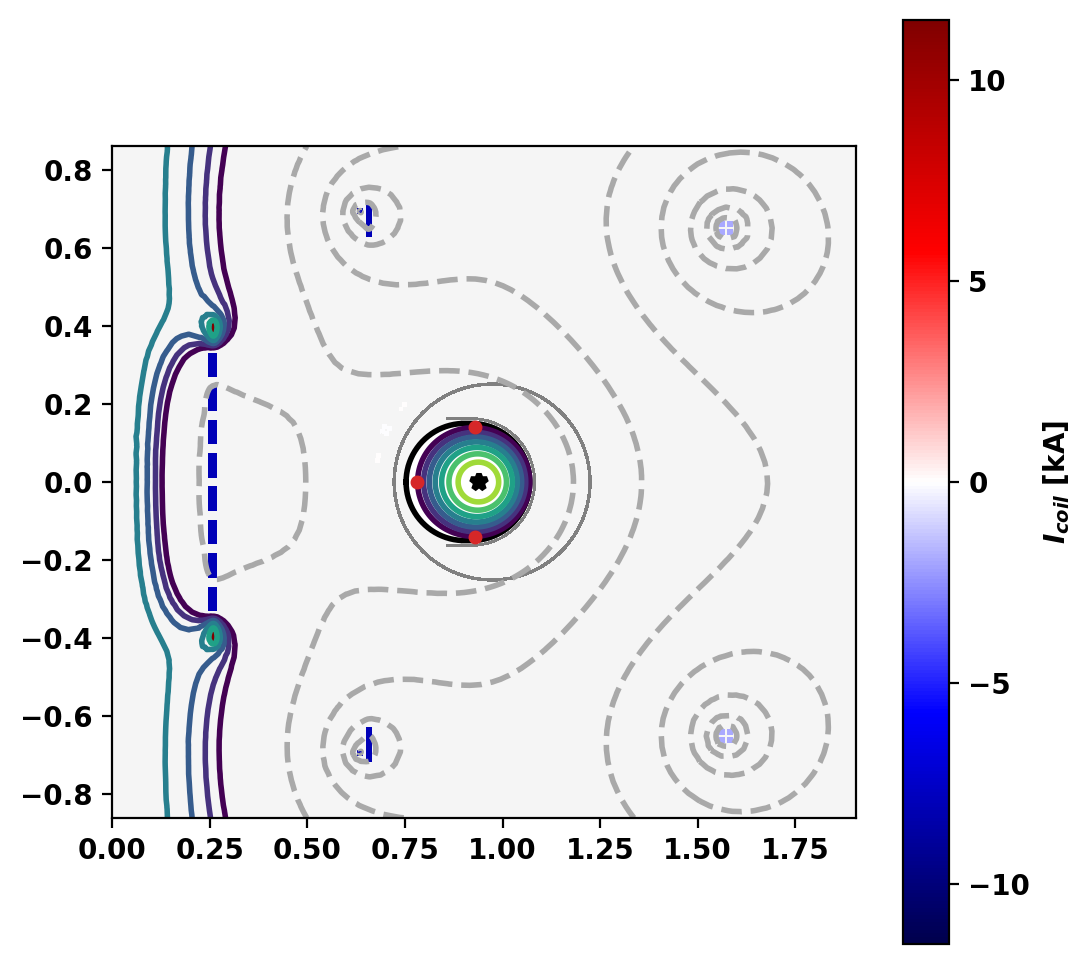 We can now compute a free-boundary equilibrium using these constraints. Note that before running a calculation for the first time we must initialize the flux function \(\psi\), which can be done using init_psi(). This subroutine initializes the flux using the specified Ip_target from above, which is evenly distributed over the entire plasma region or only with a boundary defined using a center point (R,Z), minor radius (a), and elongation and triangularity. Coil currents are also initialized at this point using the constraints above and this uniform plasma current initialization.