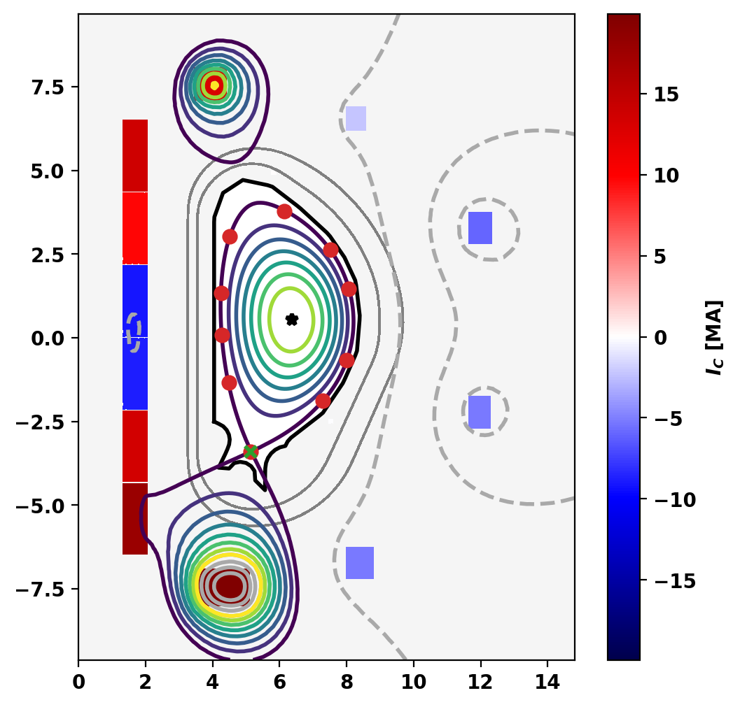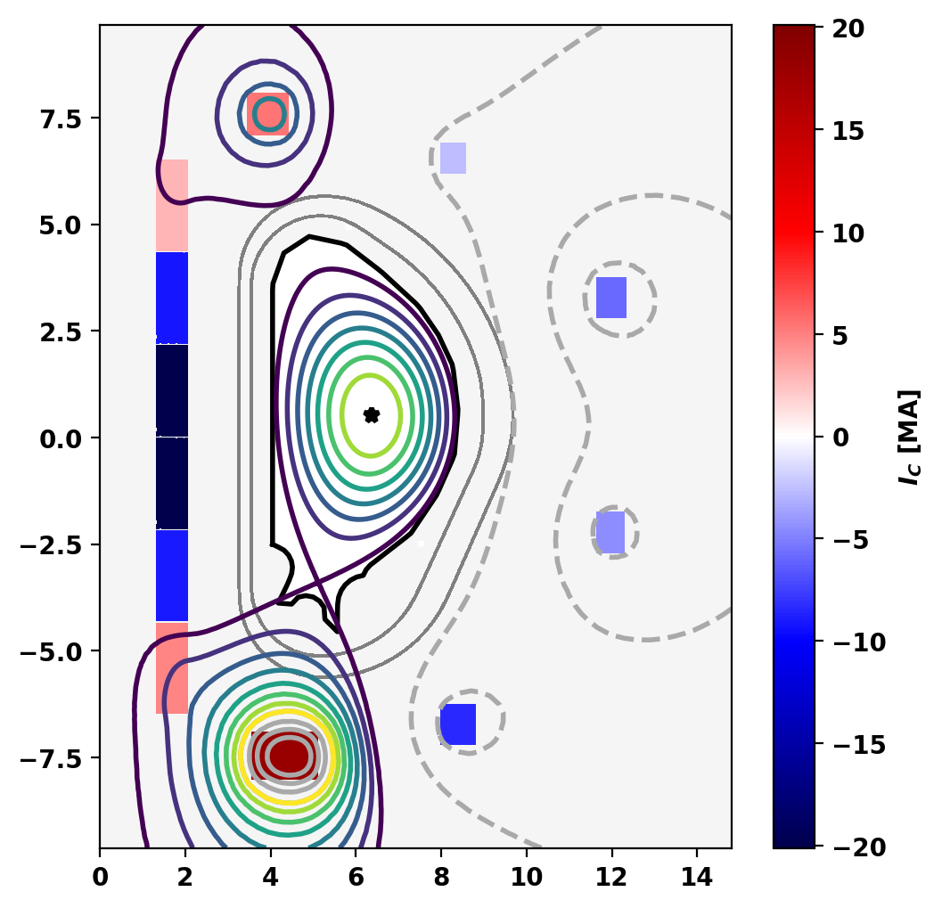 We will now demonstrate how to compute a forward equilibrium with known coil currents. Note that this method generally requires a known equilibrium, either from experimental observations or another code, as the Grad-Shafranov equation represents force-balance and as such solutions only exist for appropriate combinations of the plasma current and pressure and the supporting coil currents.