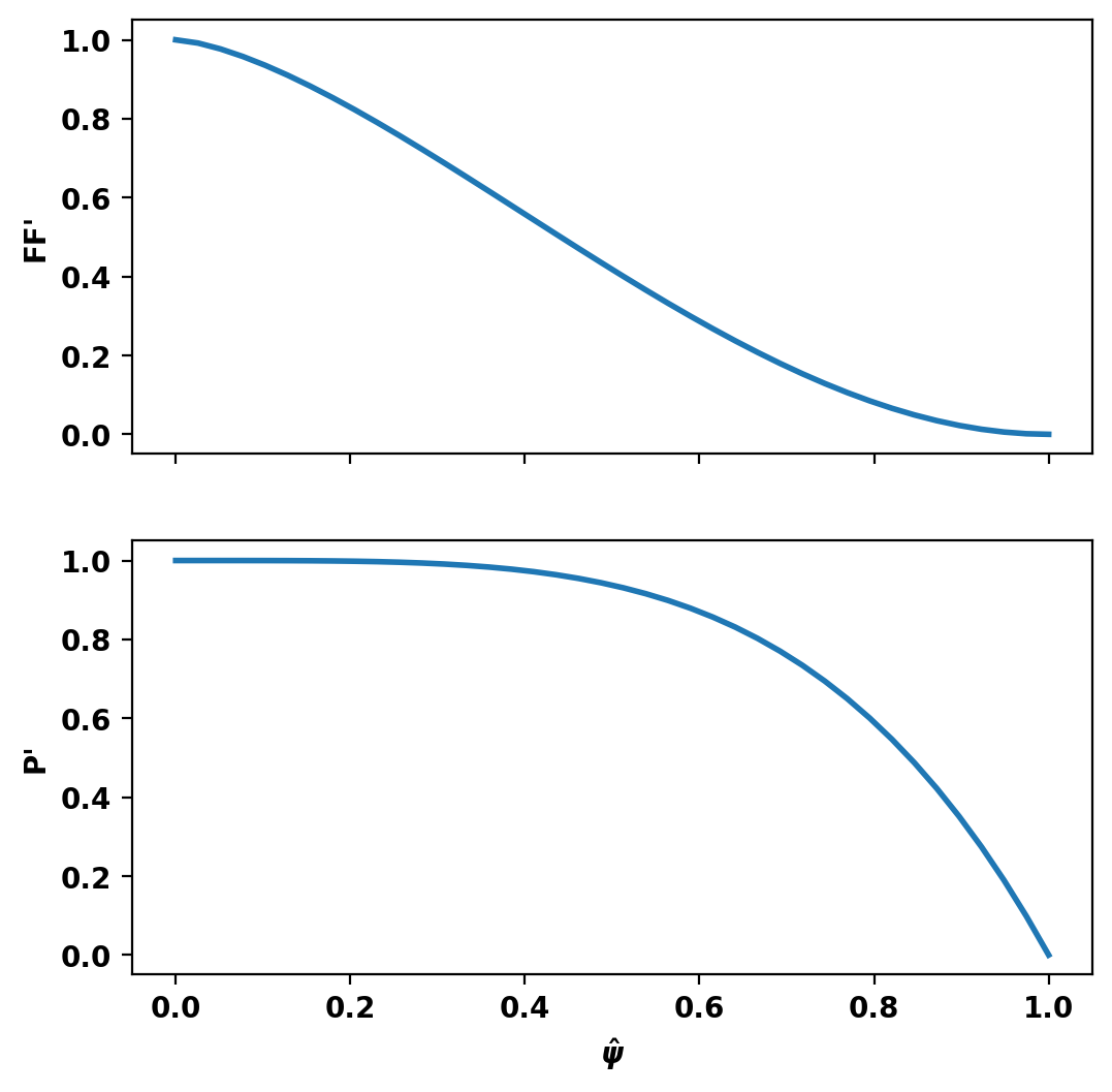 Although TokaMaker has a "default" profile for the F*F' and P' terms this should almost never be used and one should instead choose an appropriate flux function for their application. In this case we use an L-mode-like profile of the form \(((1-\hat{\psi})^{\alpha})^{\gamma}\), using create_power_flux_fun(), where \(\alpha\) and \(\gamma\) are set differently for F*F' and P' to provide peaked and broad profiles respectively. Within TokaMaker this profile is represented as a piecewise linear function, which can be set up using the dictionary approach shown below.