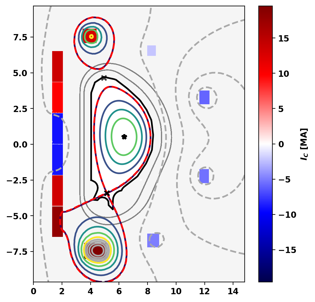 We can now compute a free-boundary equilibrium using these constraints. Note that before running a calculation for the first time we must initialize the flux function \(\psi\), which can be done using init_psi(). This subroutine initializes the flux using the specified Ip_target from above, which is evenly distributed over the entire plasma region or only with a boundary defined using a center point (R,Z), minor radius (a), and elongation and triangularity. Coil currents are also initialized at this point using the constraints above and this uniform plasma current initialization.
