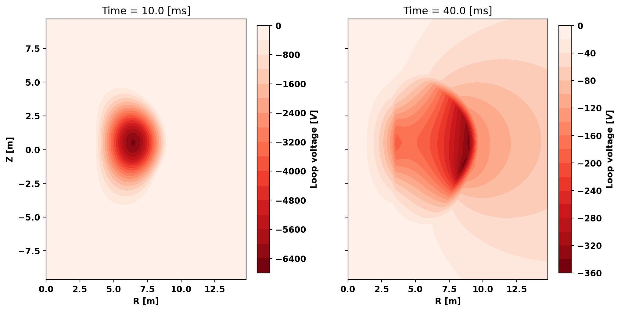 fig.colorbar(clf,ax=ax[1],label=r'Loop voltage [$V$]', shrink=0.95)