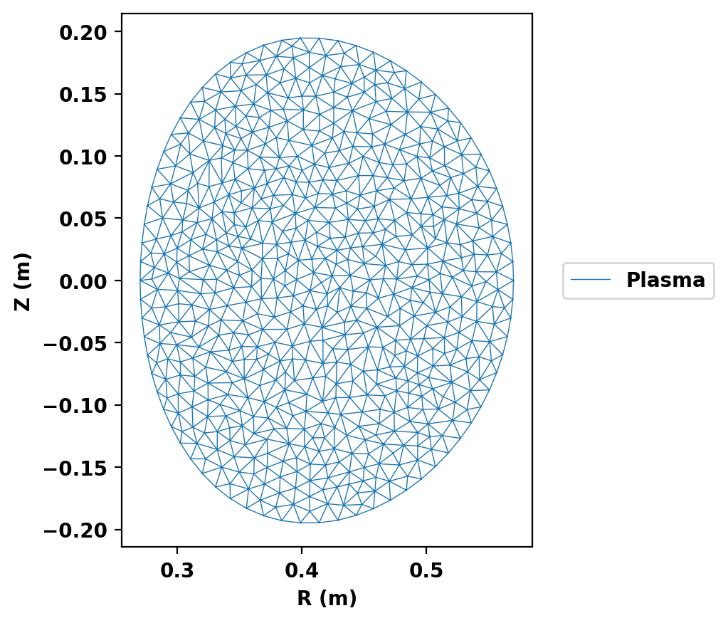 We now create the mesh object and define the various logical mesh regions. In this case we only have one region, which is named plasma and is of type plasma. See other examples for more complex cases with other region types.