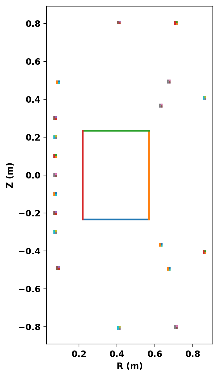 To show demonstrate the result we now compute a free-boundary equilibrium with the coil currents computed in the previous step. This will use a simple rectangular domain for the plasma, which we will design to limit on the outboard surface at the same location as the fixed-boundary case above.