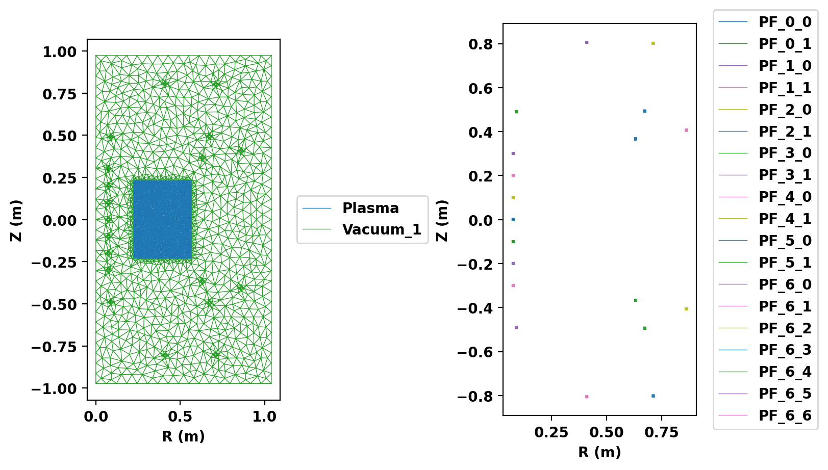 air: The region outside the limiter, which is treated like a vacuumplasma: The region inside the limiter where the plasma will existPF_I_J,...: Each of the j coils in the i coil sets defined aboveFor each region we provide a target size and specify the region type: