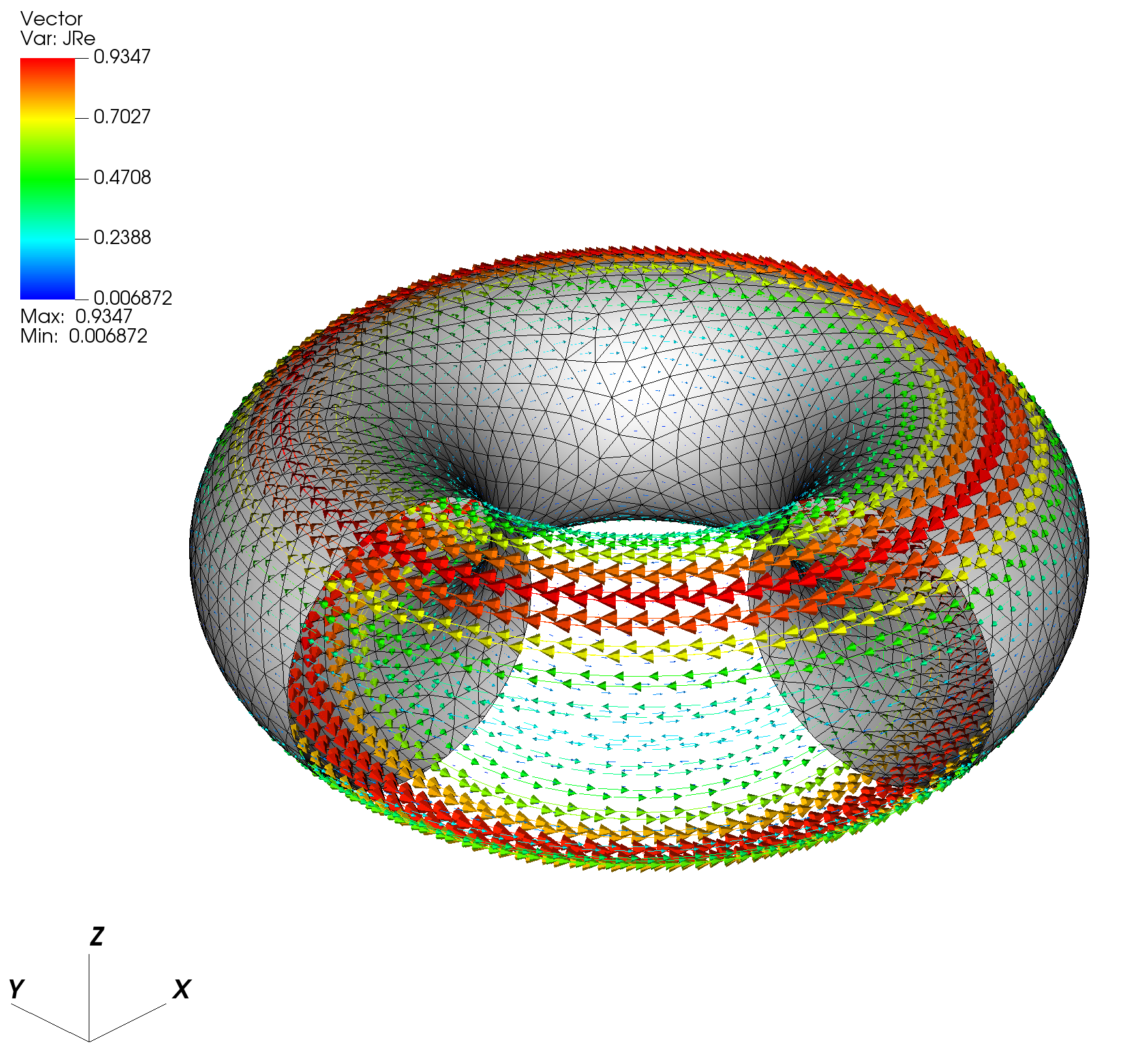 Next use VisIt to open the surf_static.xmf file, which will contain two vector fields JRe and JIm that correspond to the current distributions for the real and imaginary components of the solution in the frequency-domain. If you are running this example remotely and using VisIt locally you will need to copy the mesh.*.h5, scalar_dump.*.h5, vector_dump.*.h5, and *.xmf files to your local computer for visualization. The real component JRe should look like the figure below.